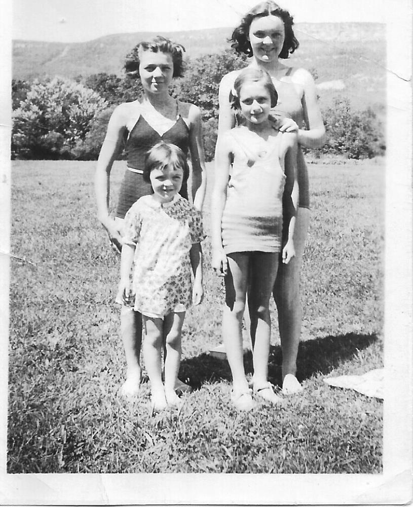 Three sisters Katherine Harold Barbara Joe Birthday early 1950s from Karen.jpg